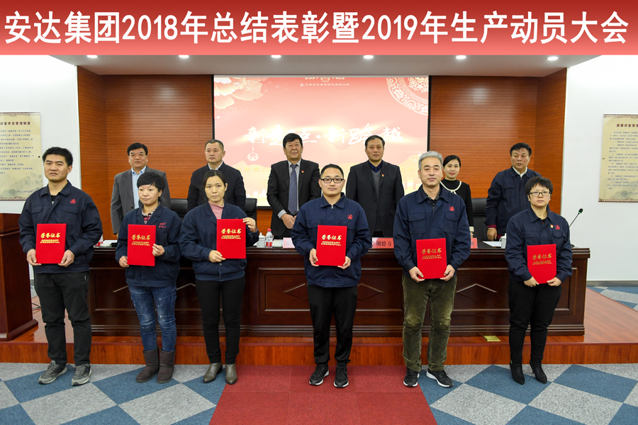 黨委書記、董事長崔洪金首先對獲獎的團體、個人表達了由衷的祝賀并在大會上作出重要講話,他指出:2018年,是貫徹黨的十九大精神的開局之年,是改革開放40周年,同時也是安達集團成立的第30個年頭。面對國際經濟形勢的復雜多變,面對改革開放的全面深化,面對市場不確定因素的進一步增多,面對政策制度的不斷調整,全體安達人不忘初心,正視挑戰,積極作為,迎難而上,整體經營形勢逐步好轉。相比去年,物流板塊在產值上有所突破;機械板塊平穩中有亮點;電子和生物制藥板塊蓄勢待發,銷售服務探索前行,春天在向我們招手。同時2019年,將是安達集團滾石上山,爬坡較勁的攻堅之年,強化改革、戰勝困難的轉折之年,夯實基礎、強力發展的關鍵之年,我們面臨機遇,也面臨挑戰,齊心協力、克服困難、創新發展是我們的不二選擇。希望大家:一是要認清形勢,抓住機遇,融入國家發展戰略;二是弘揚傳統,激勵斗志,持之以恒穩步向前;三是健全制度,創新模式,科學管理,提高效益;四是齊心協力,加快發展,增強員工的獲得感。安達人團結一心,眾志成城,安達集團定將屹立潮頭,取得更加輝宏的成就!
